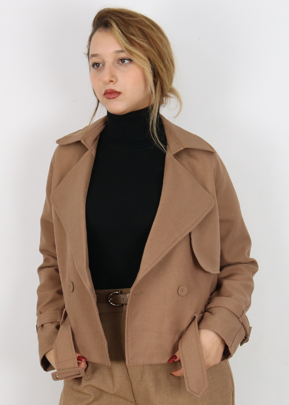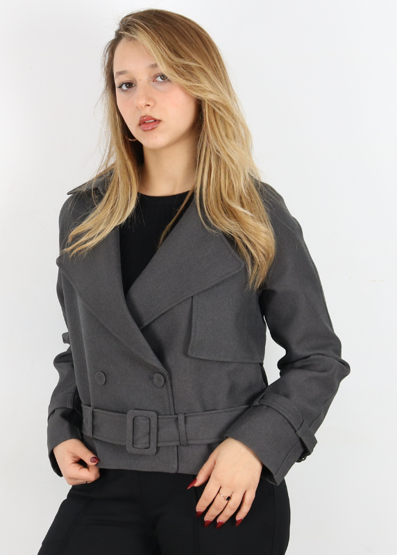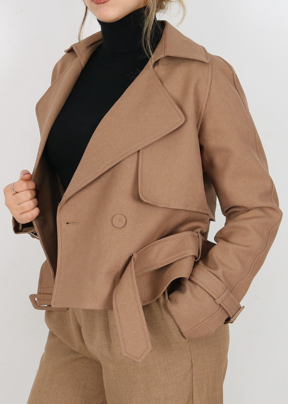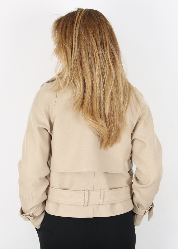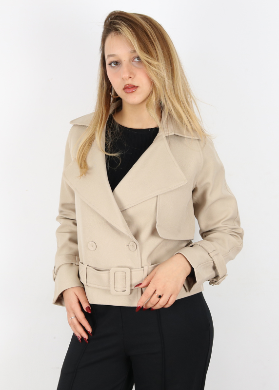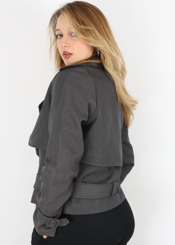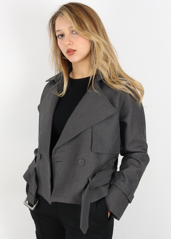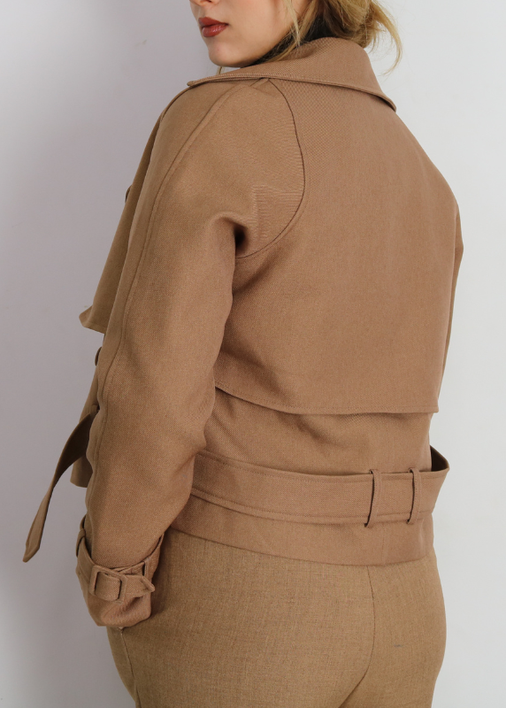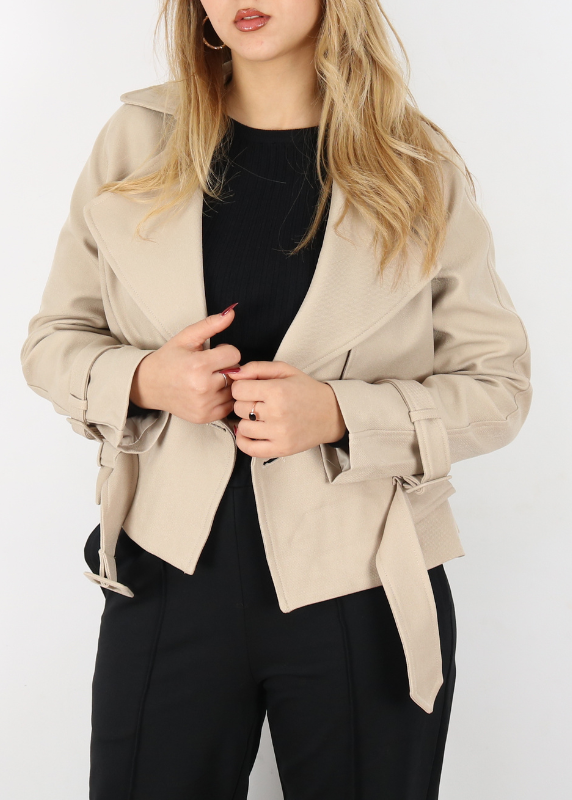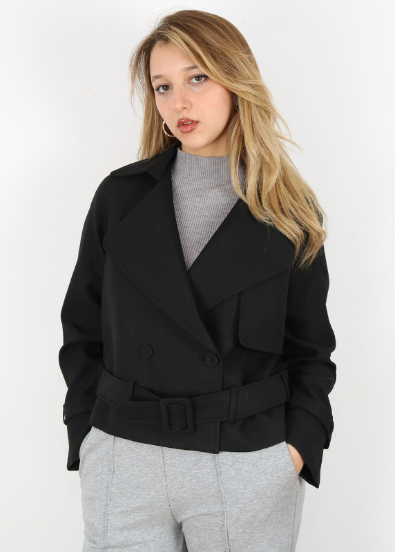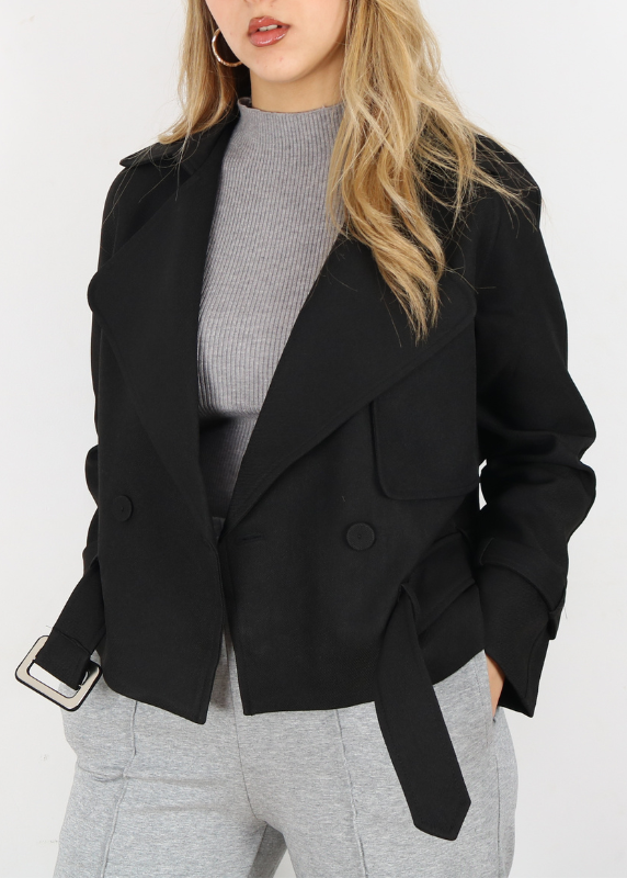 – Une coupe courte avec une finition structurée et ajustée. Le design double boutonnage ajoute une touche classique – Tissu épais, idéal pour l’automne ou l’hiver – Large col rabattu – Ceinture assortie à nouer pour accentuer la silhouette -Manchettes avec des sangles et boucles décoratives